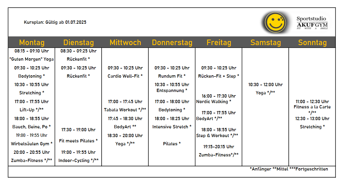 Das rundum Sorglospaket mit dem Besten aus Aerobic, Step-Aerobic, Bodytoning und Stretching. Die eineinhalb Stunden garantieren durch ihre verschiedenen Trainingsformen zum Wochenausklang Abwechslung, Schweiß und eine Menge Spaß.